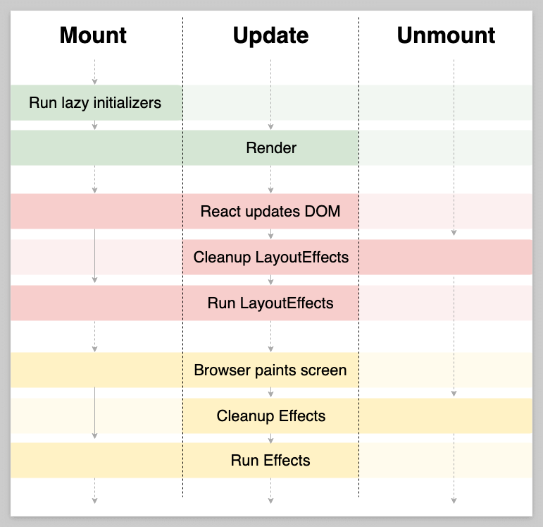 먼저 다이어그램을 통해 useLayoutEffect() 와 useEffect() 가 변경사항이 발생했을 때 언제 실행되는지 보면 좀 더 이해가 편하다.